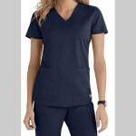 V-neck style. Short set-in sleeves. Two large, top-loading patch pockets. Hidden accessory tape inside right pocket. Cell phone pocket. Side vents for movement. 65% Polyester/35% Cotton Medium length: 27 3/8"