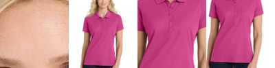 100% polyester wicking smooth knit * Wicks Moisture * Odor resistant * Ladies' fit * Tag-free label * V-neck collar * Contrast color collar and princess seams * Set-in cap sleeves
