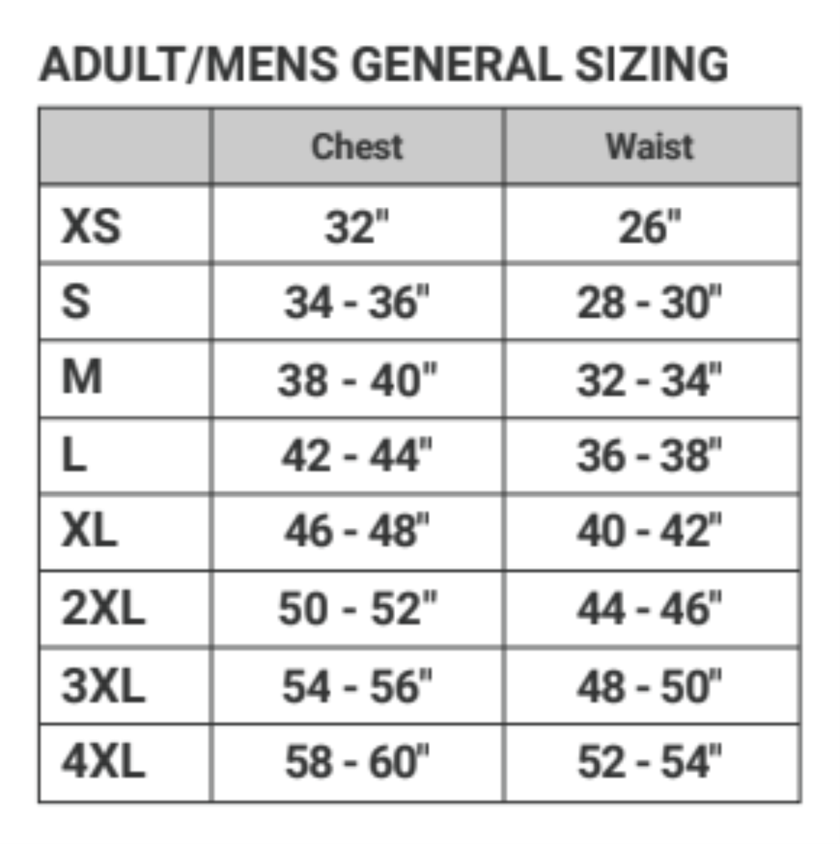 | Chest | 32-34 | 35-37 | 38-40 | 41-43 | 44-46 | 47-49 | 50-53 | 54-57 |