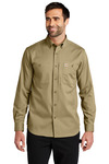 Clean and simple, this button-down work shirt can do it all. A triple-stitched, wrinkle-free design maintains a professional appearance, day in and day out. 5-ounce, 58/39/3 cotton/poly/spandex Rugged Flex ® durable stretch technology for ease of movement Button-down collar Two chest pockets with button closures Left chest map pocket with zipper closure Carhartt label sewn on left chest pocket Carhartt-strong, triple-stitched main seams Relaxed fit