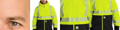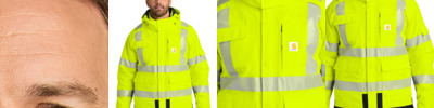 6-ounce, 100% polyester shell waterproof membrane Quilted, brushed 100% polyester lining Meets ANSI 107 Class 3, Type R visibility standards Reflective material segmented for breathability Rain Defender ® durable water repellent Fully-taped waterproof seams Snap-on hood Full-zip front with storm flap Two utility bands at shoulders Interior stretch storm cuffs Right chest flap pocket with hook and loop closure Left chest map pocket with waterproof zipper closure Left sleeve flap pocket with hook and loop closure Two lower-front double pockets with top and side entries Carhartt label sewn on top left pocket Reflective material maintains performance through 75 home launderings This garment must be fully zipped to be in compliance with ANSI/ISEA 107 standards