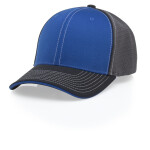 100% cotton twill fabric; Three panel construction with 2 ¼" tall front panels; Pre-curved PE visor; Charcoal colored fronts and white contrast colored stitching on all colors; ProSweatband with twill face.